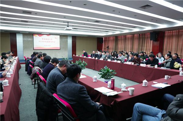为贯彻落实党的十九大精神,学习领会习近平新时代中国特色社会主义思想,深入开展“不忘初心、牢记使命,贯彻落实党的十九大精神”学习实践活动,总结2017年我校教师思政工作和教师党建工作,更好地推进学校“双一流”建设,迎接学校第十三次党代会的胜利召开,我校于1月18日上午在闵行校区举行“不忘初心、牢记使命,以更大担当作更大贡献” 2018年党建研究年会。校党委书记童世骏,校长钱旭红,校党委副书记杨昌利、方平,副校长孙真荣、梅兵、李志斌、汪荣明,校党委委员、校纪委委员,校长助理,实体院系级单位党政正职,职能部门和直属单位负责人,基层党支部书记代表和各民主党派负责人出席会议。会议由校党委副书记、纪委书记杨昌利主持。